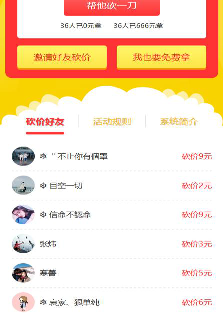 其次就是邀请好友助力砍价,好友助力每次砍价金额为电脑随机抽取的金额,系统会自动将发起者所有好友砍价金额进行累加,最低可砍到0元。活动时间一截止,砍价页面自动关闭,以其好友助力砍价后的最终金额为其购买系统的价格。