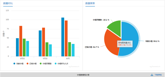 在统计分析功能中主要包括统计查询、员工统计、六大服务类型统计。在统计查询页面中,系统自动生成当前社工机构或社工的服务数据统计表和服务数据柱形图,具体包括咨询、探访、个案、小组、社区活动、社区专案、项目六大社工日常服务档案数据。社工机构和社工也能自主按照时间、部门、人员等随时查询和下载。系统也分别帮助社工机构和社工统计分析了社工的咨询、探访、个案、小组、社区活动、社区专案、项目,并以图形对比方式呈现,让社工和社工机构直观掌握各项服务类型的变化情况。除了服务档案数据的统计分析,系统在员工统计页面帮助机构自动统计员工信息,如机构员工持证情况、男女比例等。