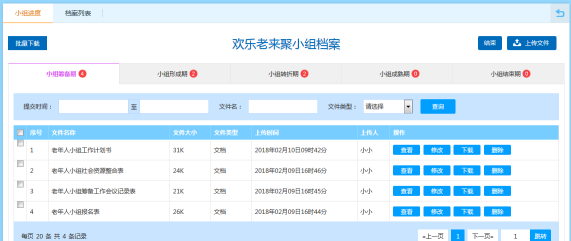 服务管理主要包括社工日常的六大服务档案管理,具体分为咨询档案、探访档案、个案档案、小组档案、社区活动档案、社区专案档案、项目档案。在服务档案管理中,社工可以在相应的服务类型中创建服务、填写相应服务的基本信息,直接上传线下填写好的服务档案即可,系统会自动将社工创建的服务生成相应的服务列表,对于社工填写的服务信息、上传的服务档案,社工都能在线上随时查看、修改、下载。在个案、小组、社区活动、社区专案、项目这些有较长服务过程的服务时,社工可在线进行整个过程的档案管理,比如个案创建后,社工可根据日常个案开展进度,按照接案——预估——计划——介入——评估——结案这样的流程过程进行服务档案的完整记录。系统中服务流程阶段的设置可由机构按照实际需求自行决定。系统对档案的支持类型也是丰富多样的,具体包括文档、图片、视频、音频等。