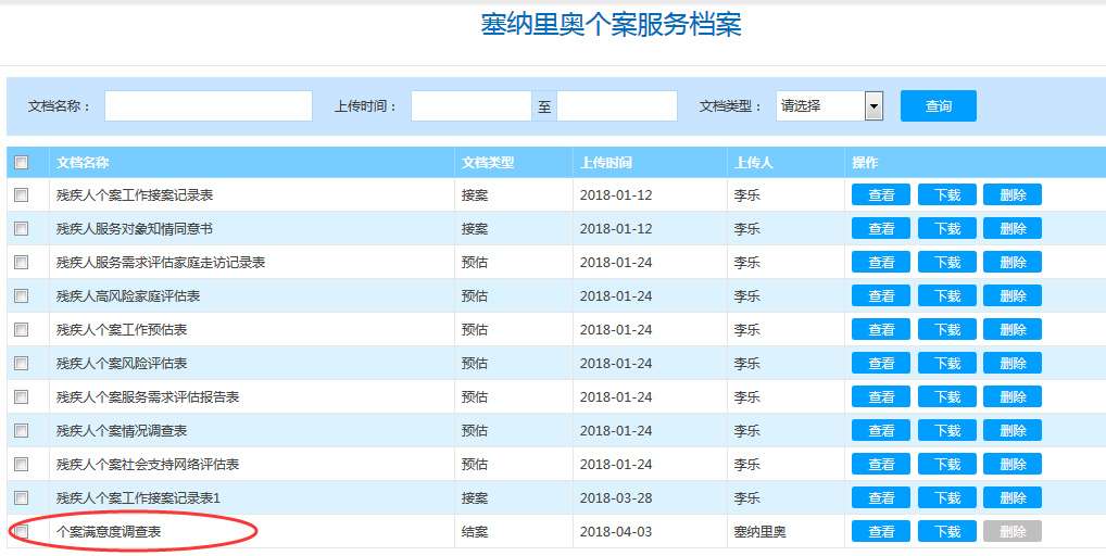 服务对象接受服务后,可扫描社工提供的二维码或链接填写满意度调查意见。当服务对象填写好提交的服务满意度调查表,系统会自动生成文档列在对应服务的服务文档里面,如服务对象完成个案服务满意度调查表,填写提交后,社工可在对应的个案文档中查看到服务满意度调查表。