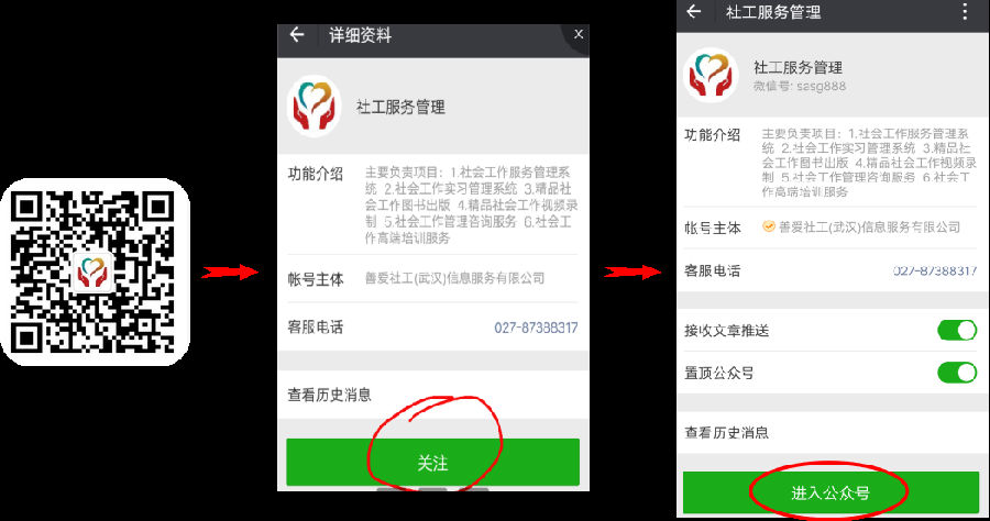 1、扫描二维码,关注“社工服务管理”微信公众号,并进入;