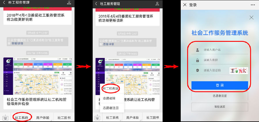 2、进入公众号之后,在下方“社工系统”栏目中点击“社工机构端”,即可进入社会工作服务管理系统登录页面。